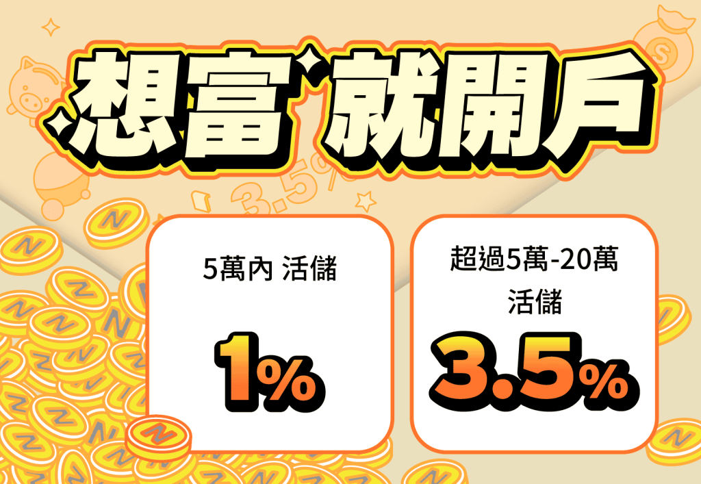 新戶不需完成任務,即可享有新臺幣10萬元(含)以內 3.5% 高額活儲年利率!
