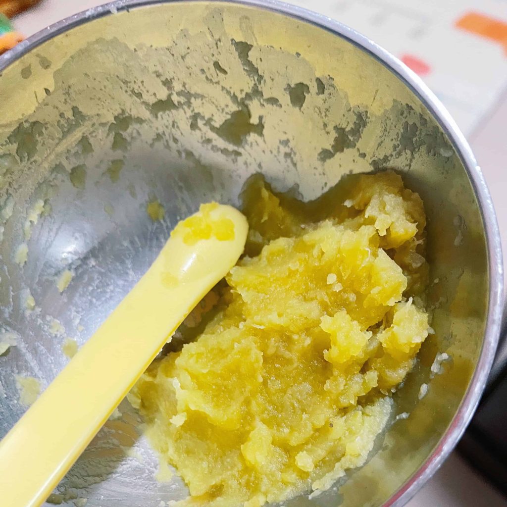 3. 煮熟後,用湯匙地瓜很好壓成泥,稍微放冷即可餵食。