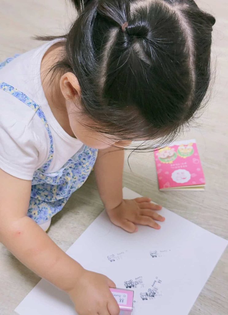 小太陽開心地蓋印章,幼童小手力氣較小,蓋衣物類建議大人幫忙喔~